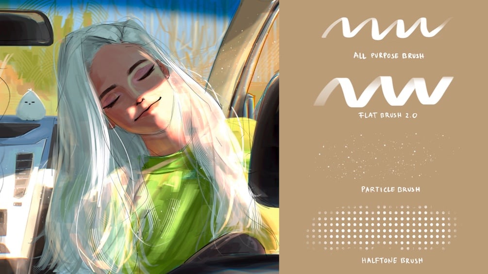 You will also get 2 types of effects brush that I am absolutely proud of! I made the Particle brush to add light-particle effects to my drawings, but put it in a multiply layer and you’ll get a very believable freckle brush! And use halftone brush to instantly make your art pop with that graphic look.